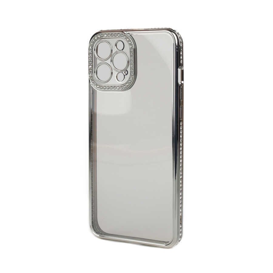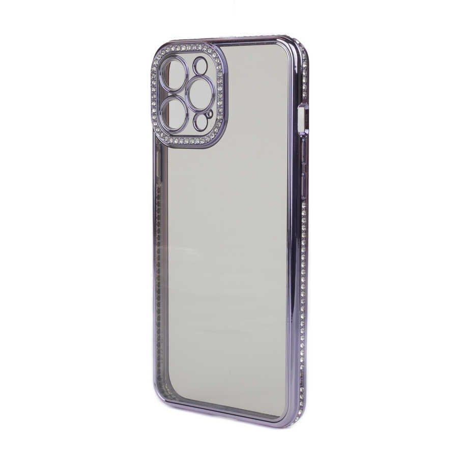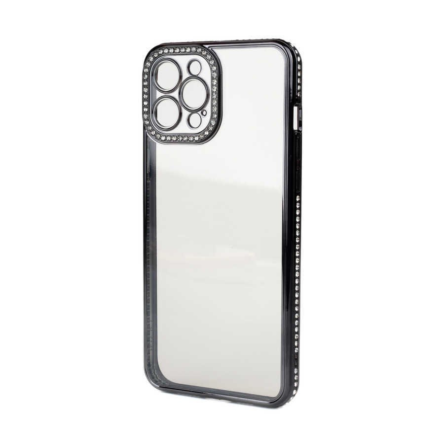 Ceponya iPhone 12 Pro Max Kılıf Şeffaf Arka Yüzey Kamera ve Kenarları Taşlı Silikon