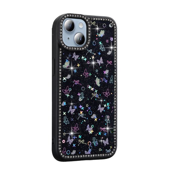 Ceponya iPhone 13 Kılıf Taşlı ve Simli Işıltılı Kelebek Kapak