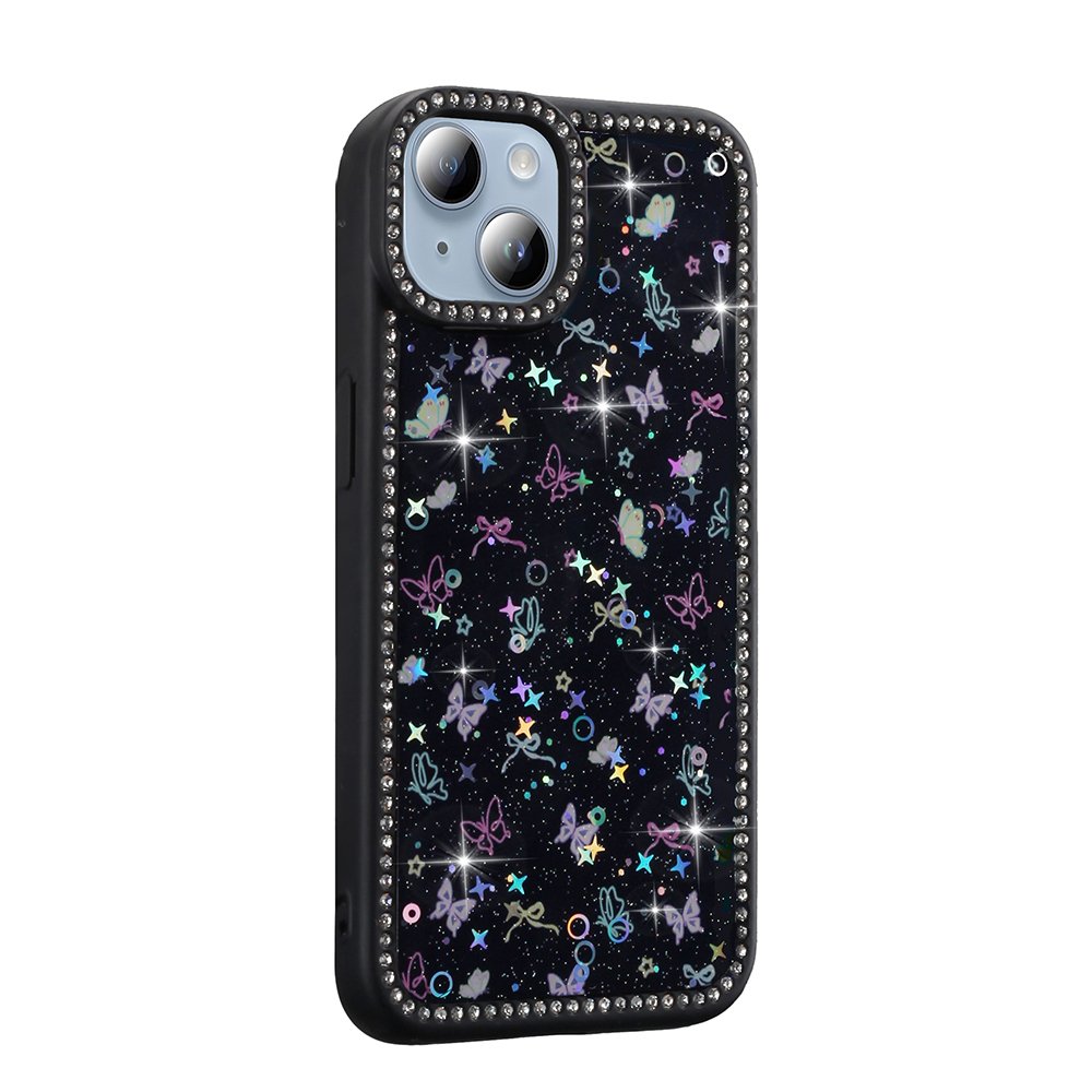 Ceponya iPhone 15 Kılıf Taşlı ve Simli Işıltılı Kelebek Kapak