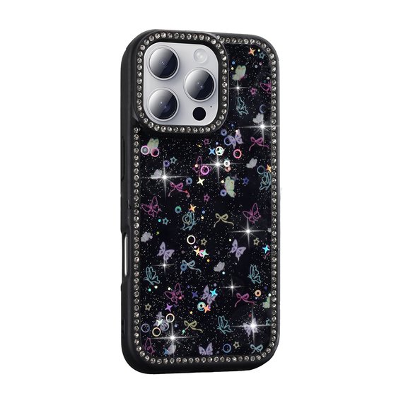 Ceponya iPhone 16 Pro Kılıf Taşlı ve Simli Işıltılı Kelebek Kapak